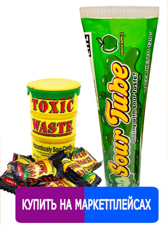 Данный набор собран из самых популярных продуктов. Знаменитые конфеты "Toxic Waste" в желтом бочонке с супер кислым вкусом! Но не выплевывайте их сразу - дождитесь момента - будет контрастный сладкий вкус! Можно играть на вечеринках - кто сможет не состроить кислую "мину" дольше всех. А тебе слабо попробовать? Конфеты "Toxic Waste являются одними из самых кислых конфет в мире, можно купить он-лайн. Американский бренд представлен на рынках Европы и Америки. Жидкая конфета в тюбике со вкусом вишни, удобно есть, не пачкая руки. Кислый сироп жидкая карамель Cry an eye аналог Кидсмании, но намного вкуснее и кислее!