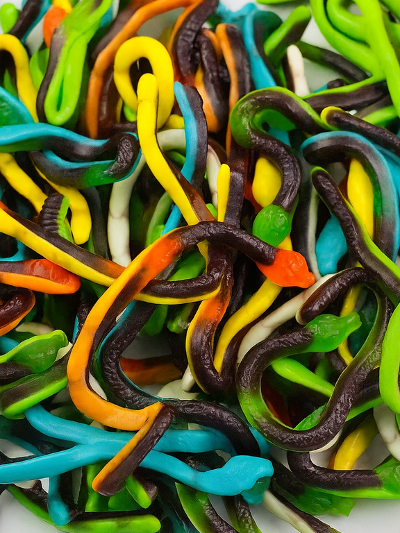 Состав: сахар, солодовый сироп, желатин, загуститель мальтодекстрин, пектин, сорбитол, регулятор кислотности Е331, вода, концентрированный яблочный сок, лимонная и яблочная кислоты, пищевые красители, пищевые ароматизаторы