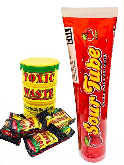 Кислый набор Toxic Waste (жёлтая бочка) и карамель "Sour tube" Вырви глаз Cry an eye/Вкус вишни