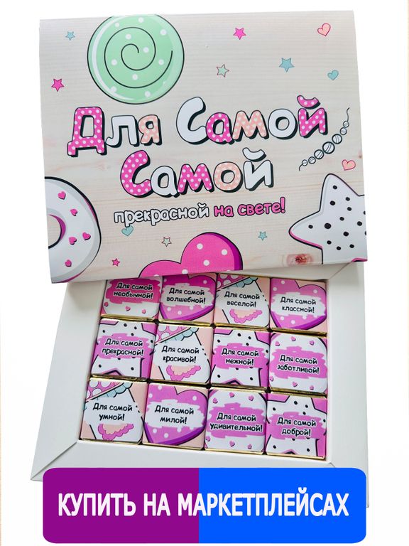 Купить шоколадный набор "Самой самой"! 12 шоколадок по 5 грамм. На каждой шоколадке индивидуальные пожелания! Подходит для девушки на любой праздник! 8 Марта, день рождения, или просто порадовать близкого человека, сказать ей что она самая самая.